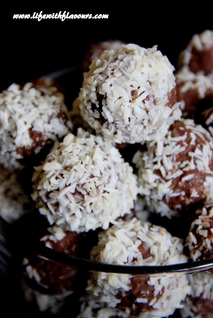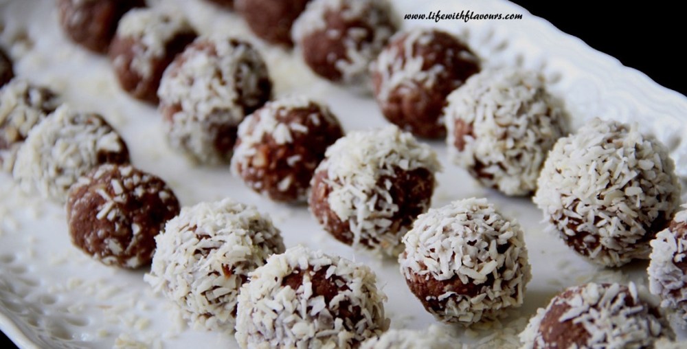 The best part of this festival is the prasad made for Ganesha Ji. Most famous Prasad is the Modak which is Ganesha Ji’s favorite. His other favorite sweet is LADOO..!! 😀 This one being my favorite too. My hubby said that he’s really bored of having the same besan ke ladoo and suggested me to make something different. So, this time I made 2 different types of ladoos; one being everyones favorite- Besan Ke Laddo (you can check out the recipe here–> Besan Ke Ladoo). For the second ladoo, I thought, whats better than chocolate. Chocolate is one thing, I’m so sure everyone relishes. Be it in a candy form or pudding or even ladoos, if you add chocolate, it would surely be a hit.. J I gave it a twist with some coconut. Even if you don’t relish coconut, still you would like them, I’m sure. J