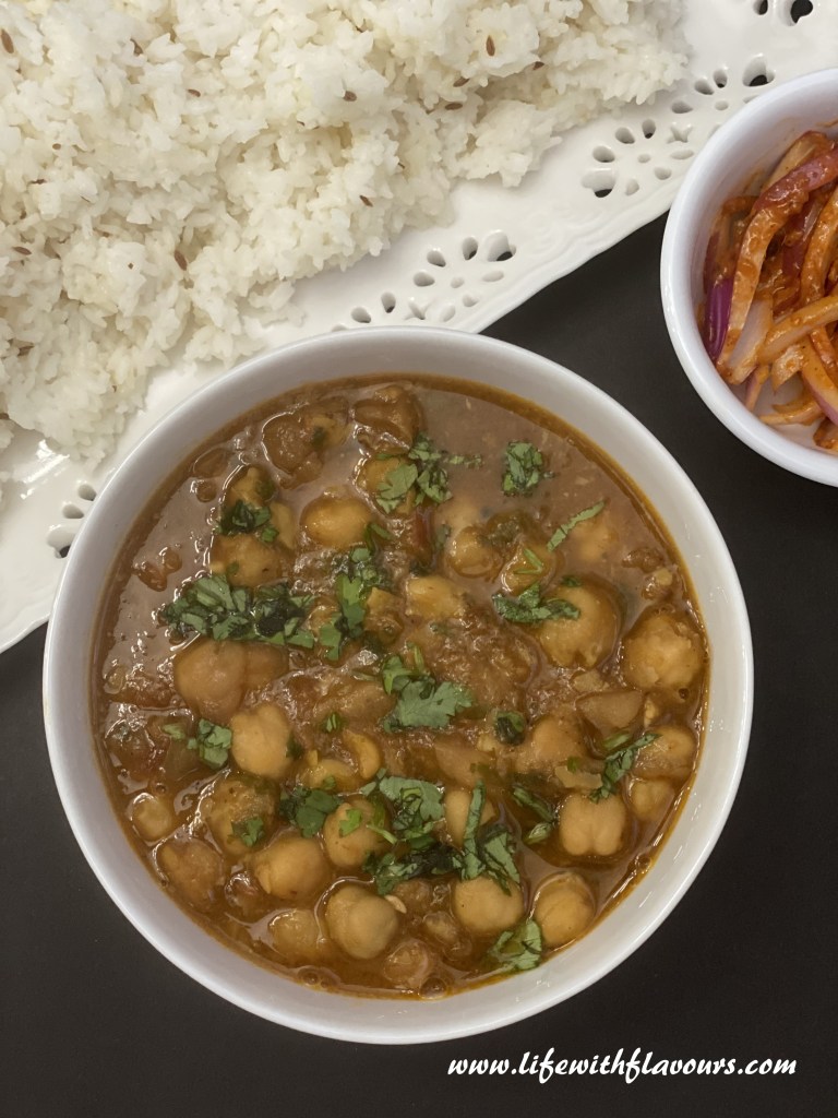 These chole are best served with (obviously) Jeera Rice and Achari Pyaaz.